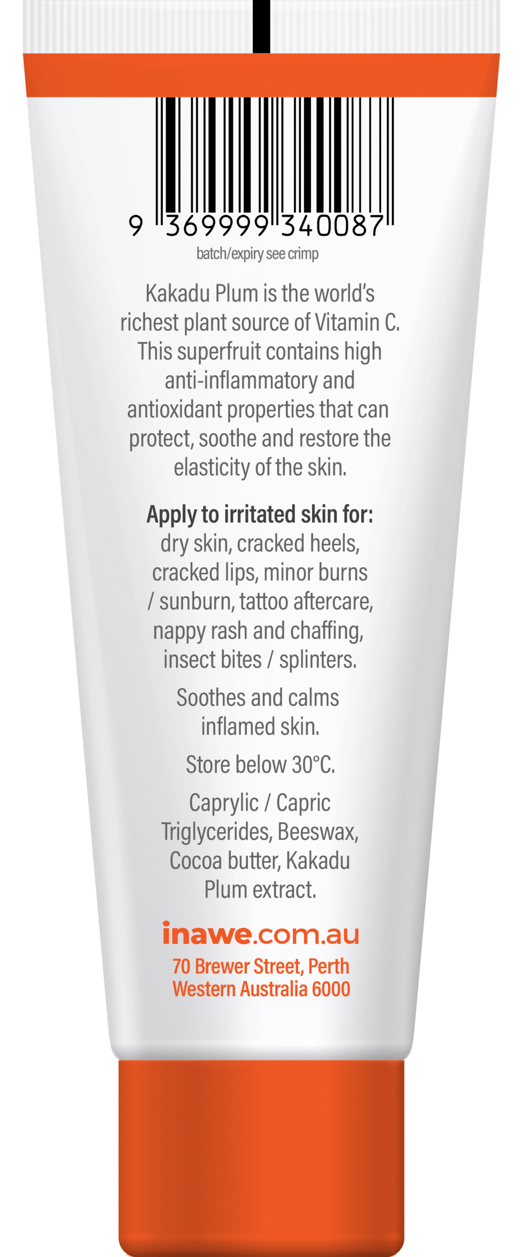 Kakadu Plum extract (contains vitamin E, zinc, iron, folate, lutein), Beeswax, Cocoa butter, Caprylic/Capric Triglyceride.